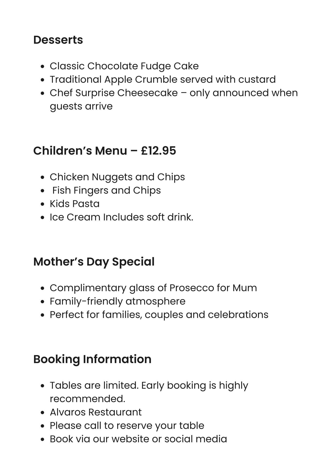 Alvaro’s Restaurant has been a cherished Portuguese and intercontinental dining spot in Westcliff-on-Sea since 1977. Now under new management, we’re expanding with fresh breakfast, lunch, and dinner menus, family-friendly options, and community-focused events. Just a short walk from the Cliffs Pavilion, Palace Theatre, and Westcliff Beach, we’re perfectly placed for theatre nights, seaside outings, and local adventures. Westcliff Station is only 10 minutes away, and Southend’s Adventure Island, pier, and town centre are under 2 miles. Whether you’re enjoying a day by the coast or an evening in town, Alvaro’s offers the ideal setting to relax and savour delicious food.